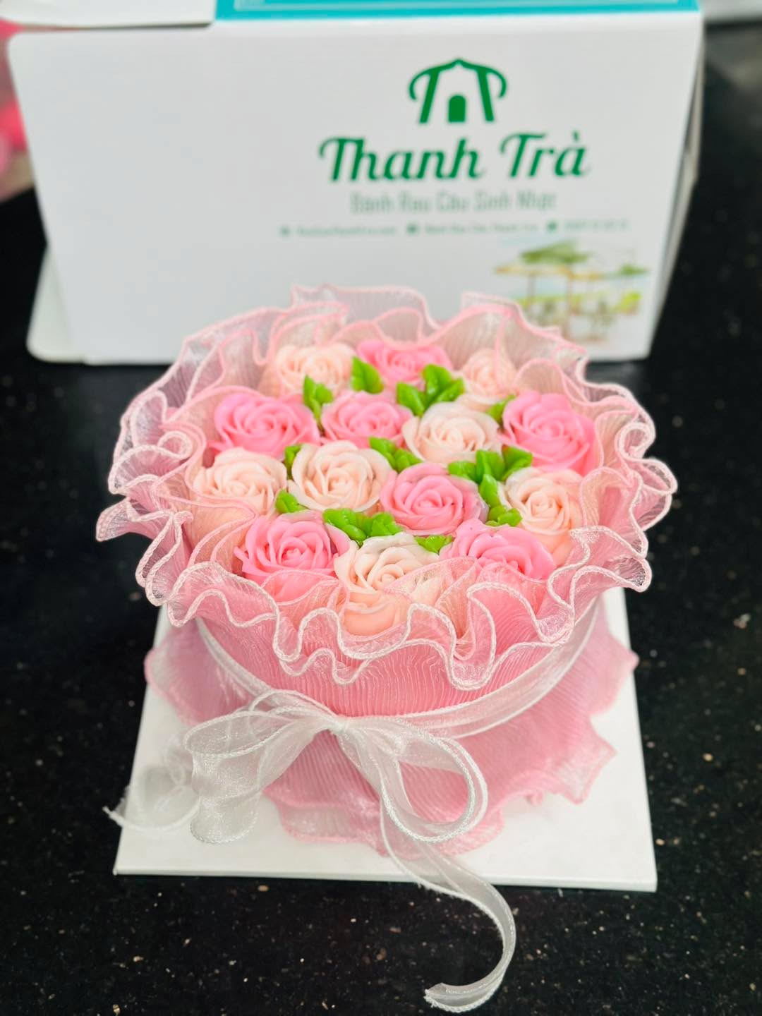 Bánh rau câu sinh nhật nhân flan, tạo hình mẫu hoa.